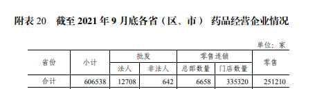 前不久,国家又公布了2021年第三季度《药品监督管理统计报告》,报告显示,截至2021年9月底,全国有零售连锁企业6658家,零售连锁门店33.53万家,单体药店25.12万家。在2020年底,全国有零售连锁企业6298家,门店数量31.29万家,单体药店24.10万家。