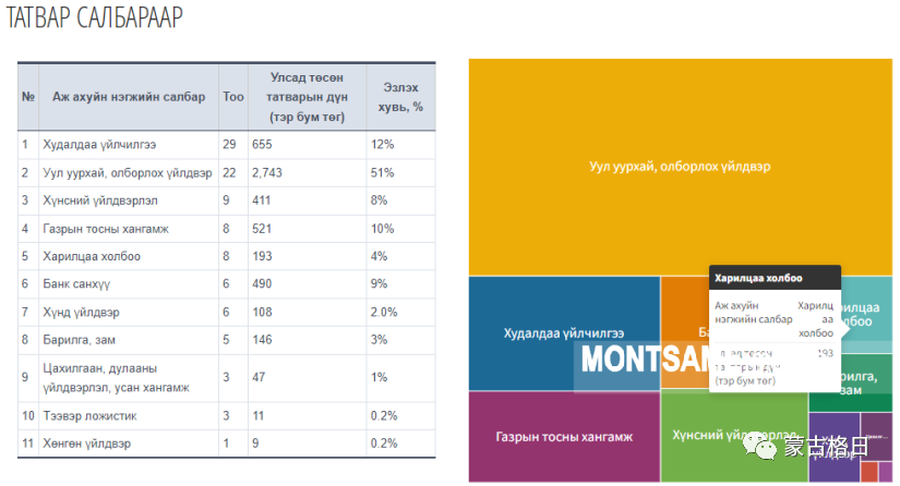 如果按照纳税额排位,额尔登特集团排名第一,之后依次是奥尤陶勒盖公司、额尔登斯塔本陶勒盖公司、АПУ公司、汗银行等。