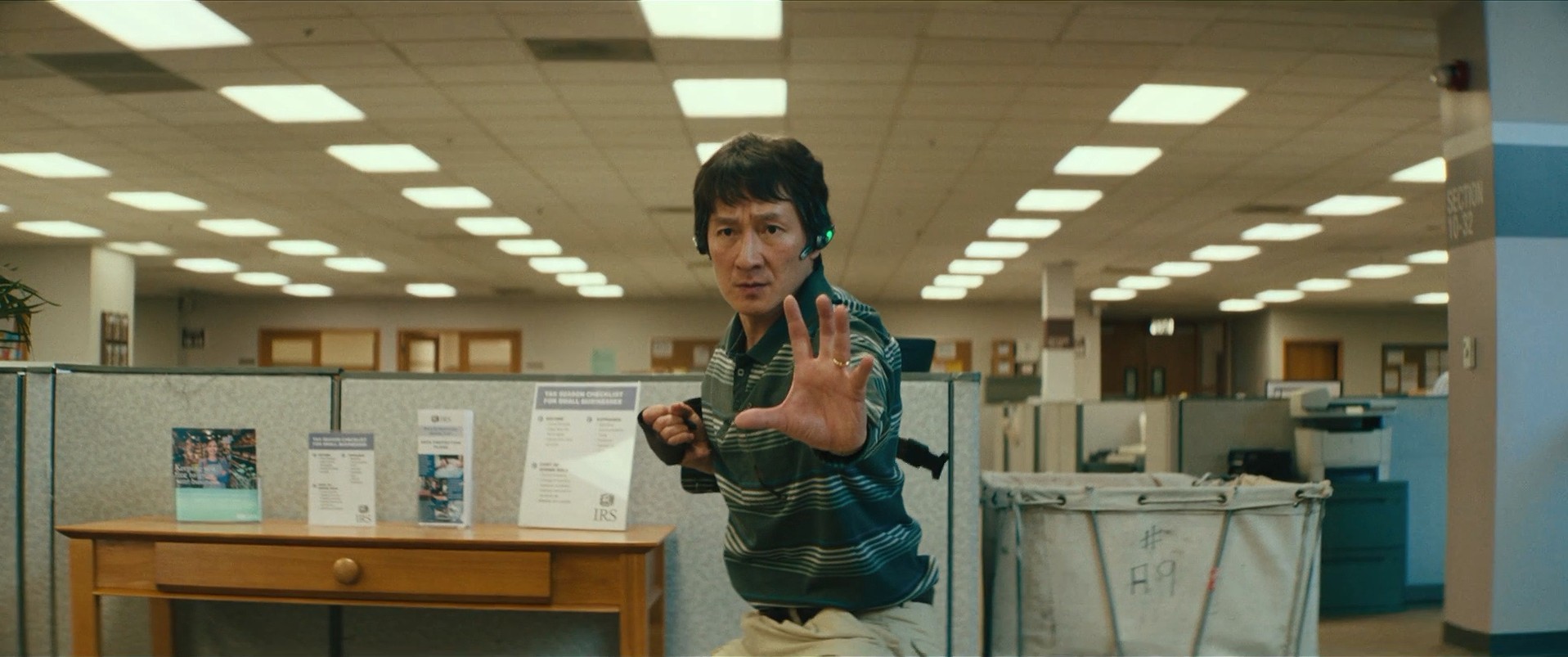 片中还有一个镜头,杨紫琼第一次发生宇宙跳跃时,她和另一个宇宙中的自己产生了连接,坐在办公椅上向后飞驰,并穿过一扇橱柜门。这个镜头有趣的地方在于,100%是摄影机拍摄的实际画面,没有任何特效。实拍过程是,导演将摄影机快门开到最大,营造出很漂亮的光线,然后推着杨紫琼,慢慢穿过办公室,她必须以慢动作演出惊吓的样子,剧组还在她身后藏了一台吹风机,她就以慢动作在小推车上被推行,最后再把镜头加速,就变成真的在这个空间中向后飞去的感觉。