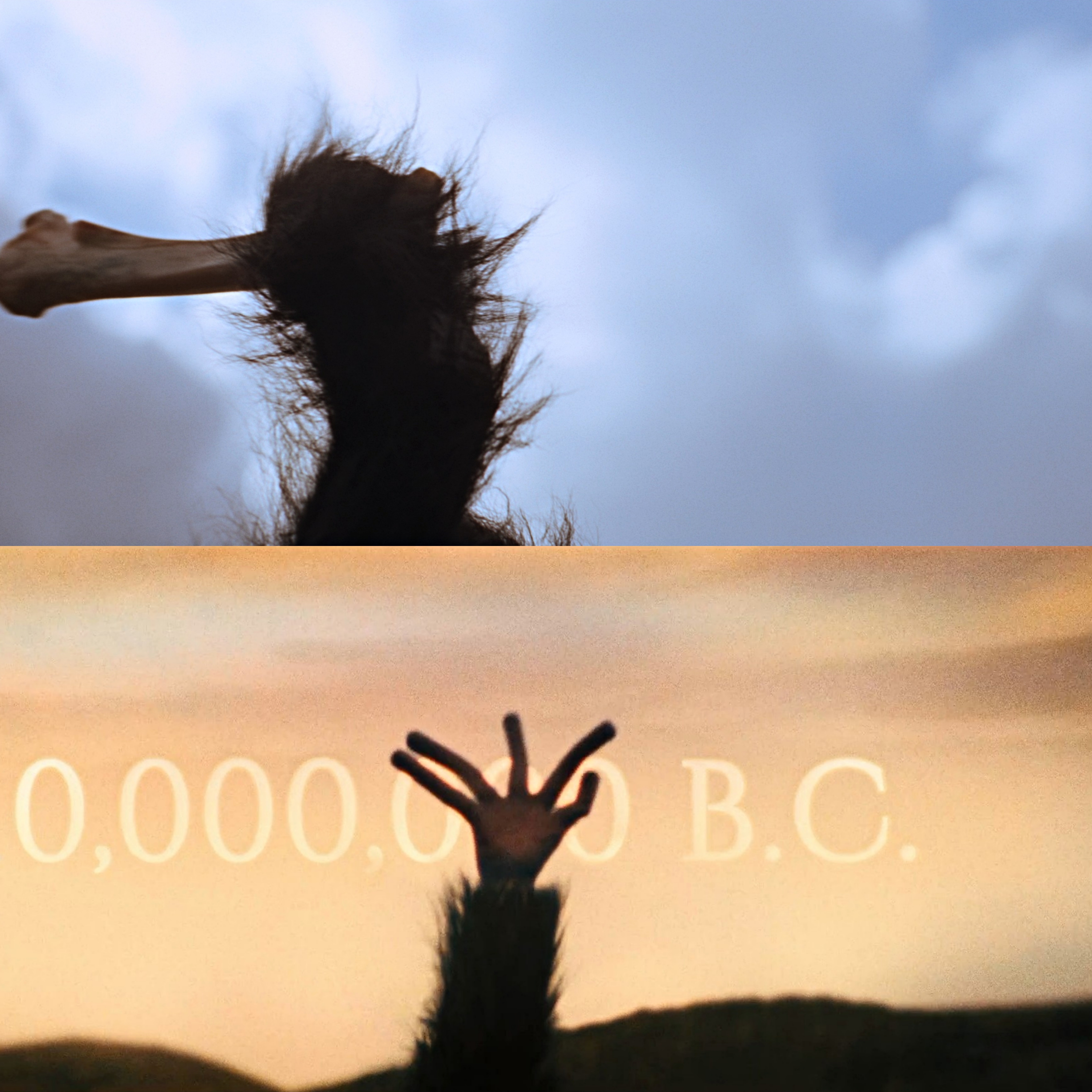 《瞬息全宇宙》中猿人的部分镜头致敬了《2001太空漫游》(上图)。