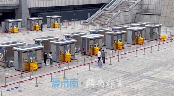 5月25日,在济南西站东侧的下沉广场,安装了48个独立封闭式的核酸检测采样岗亭,每个岗亭设有两个采样窗口,采样人员全程在岗亭内进行采样工作,与前来核酸检测的市民实现零距离接触。