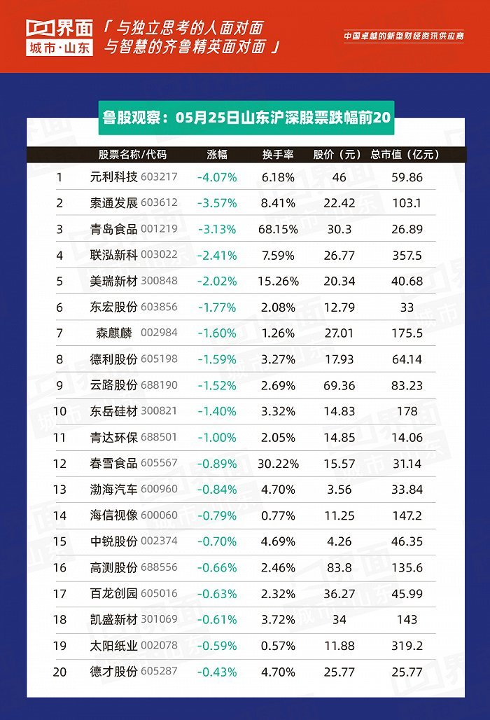 烟台市跌幅榜首:美瑞新材(300848),跌幅-2.02%,股价20.34元,总市值40.68亿元。