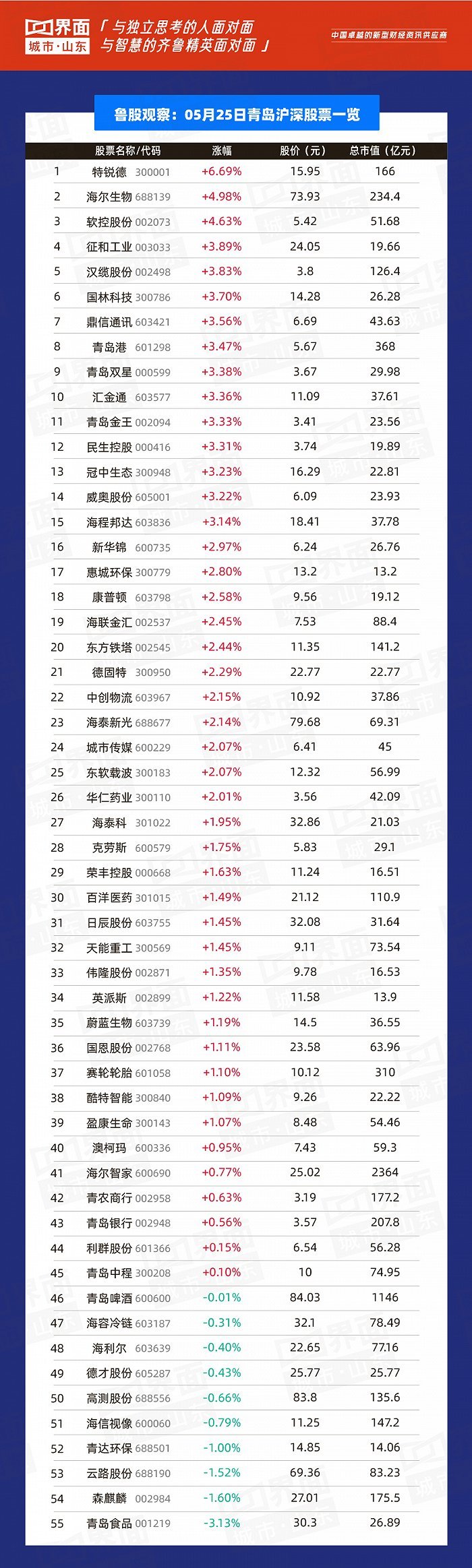青岛市涨幅榜首:特锐德(300840),涨幅6.69%,股价15.96元,总市值166亿元;