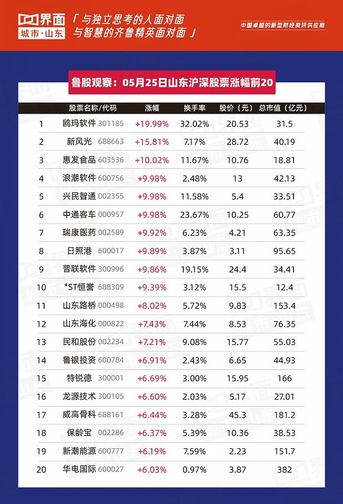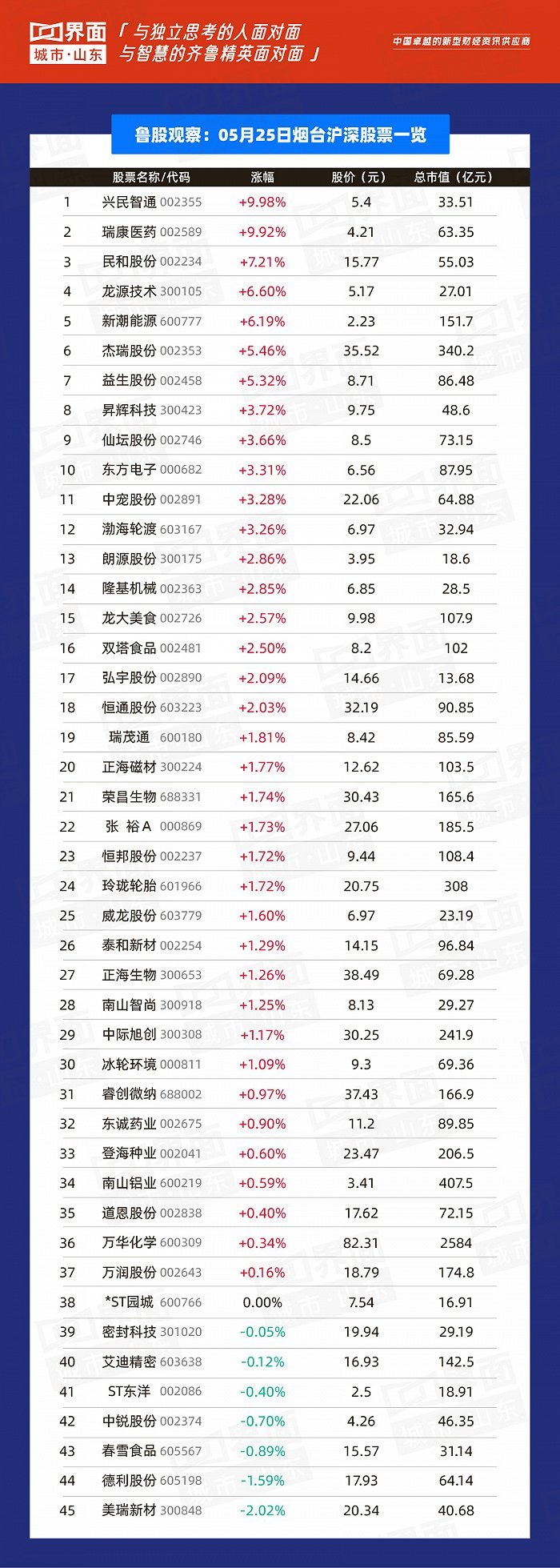 烟台市涨幅榜首:兴民智通(002335),涨幅8.4%,股价5.4元,总市值33.51亿元;