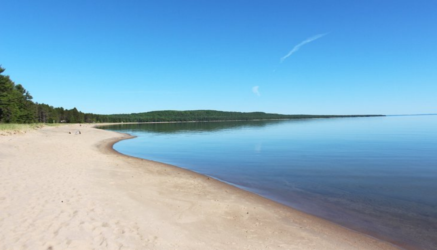 这个美丽的长弧形沙滩是苏必利尔湖上最好的沙滩之一。风景优美,松树成荫。