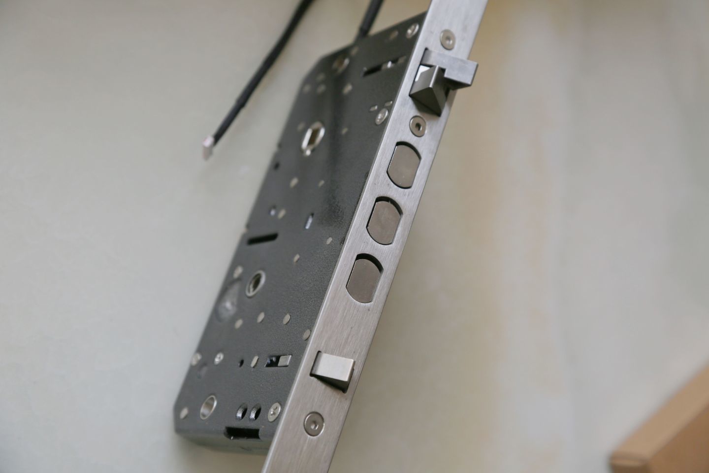 在实际使用时,为了预防孩子或宠物的误触情况,VOC的设计师在内部把手处设计了双重感应开锁,只有当手指同时按住内侧把手的开锁键和内部感应键之后,才会自动打开门锁。这样的开锁设计也可以预防不法分子试图通过猫眼从外部开启门锁的可能。
