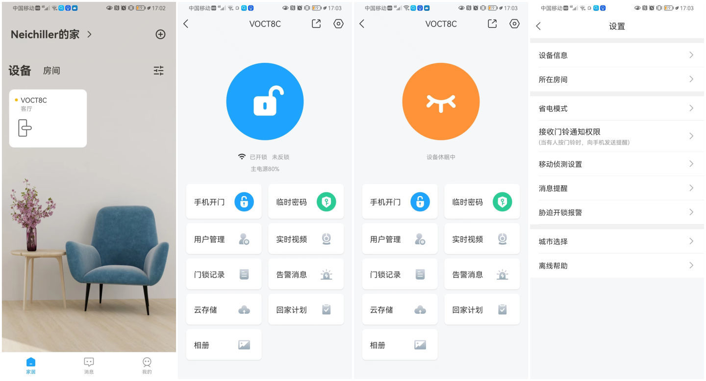 可以换通过APP,实现手机开锁、门锁记录、临时密码、告警信息、回家计划、实时视频、回家计划、人员管理、云存储、相册等功能。