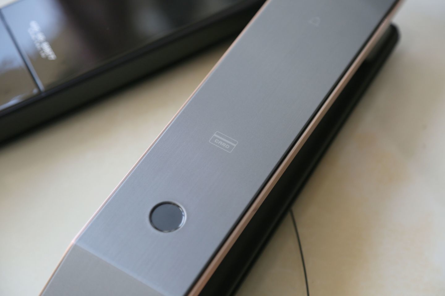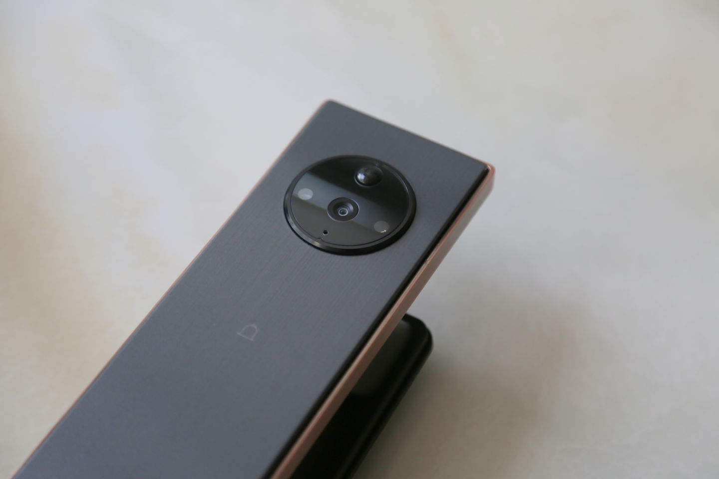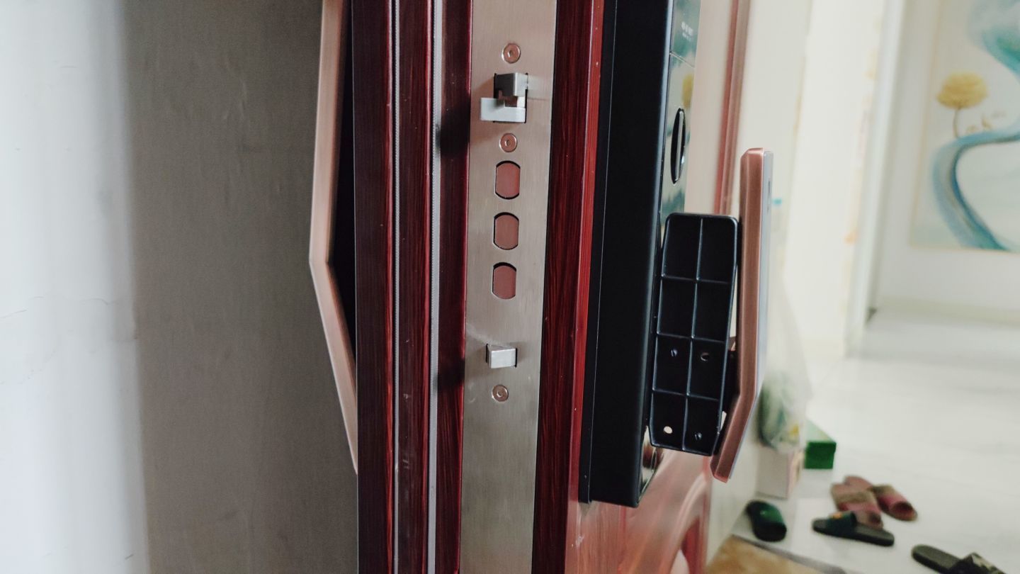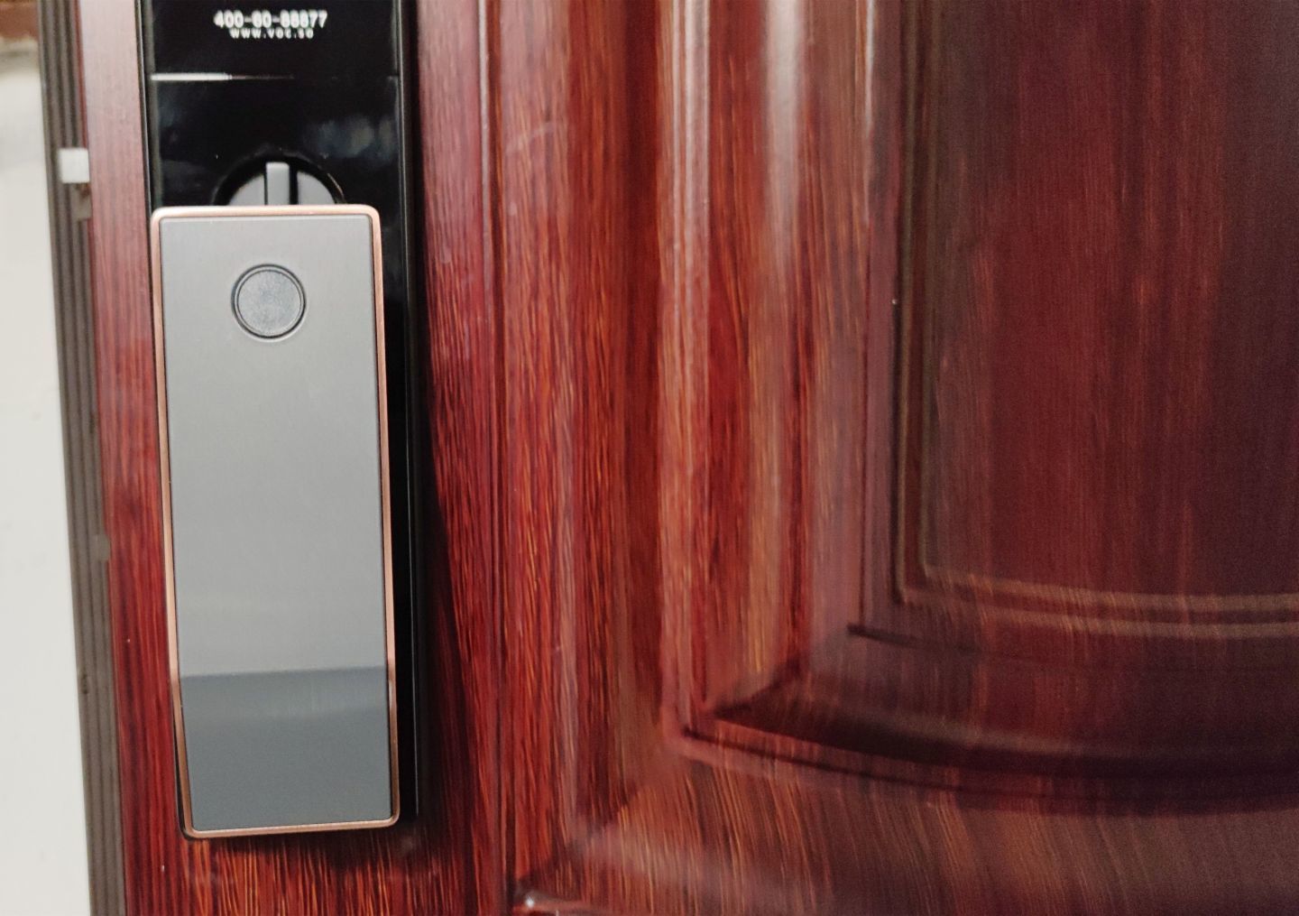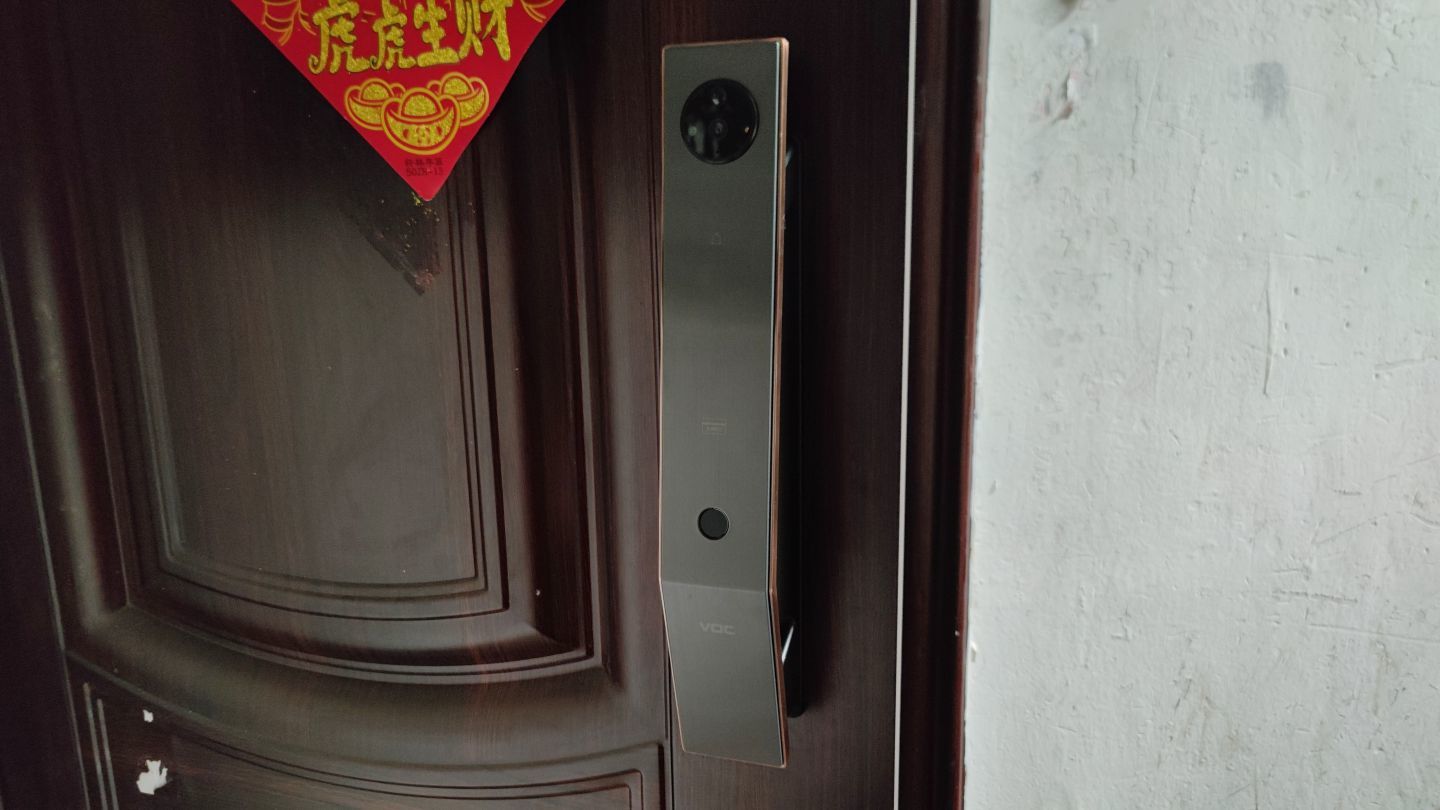 安装完的效果确实很惊艳,VOC可视对讲猫眼智能门锁T11c的整体外观也是比较高端的,采用了金属拉丝的质感, 红古铜色的配色,安装在门上,瞬间让门都有了颜值。