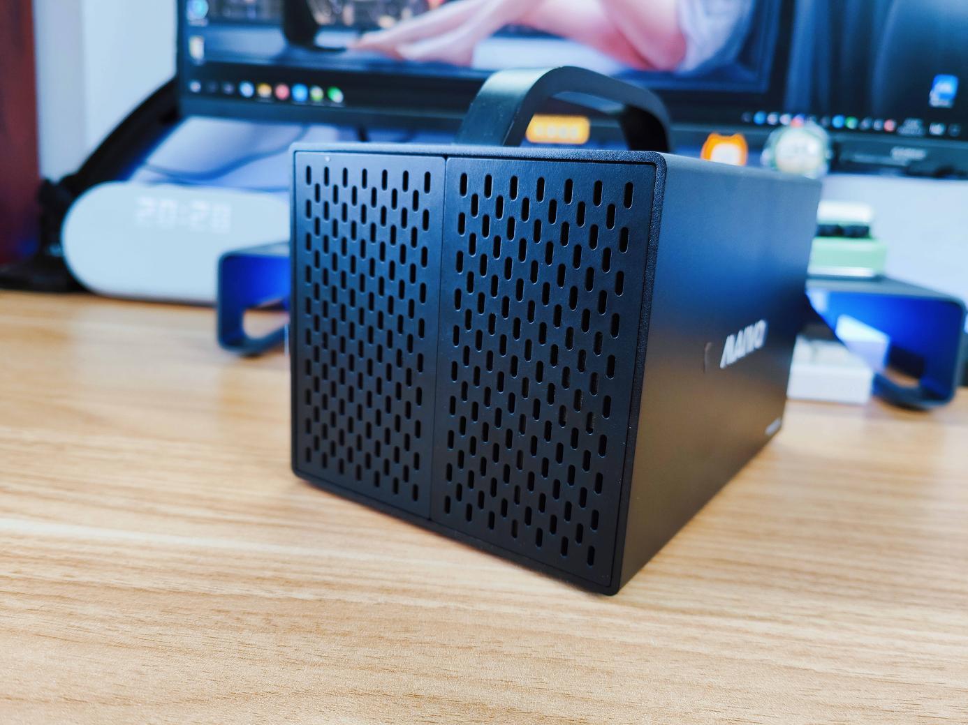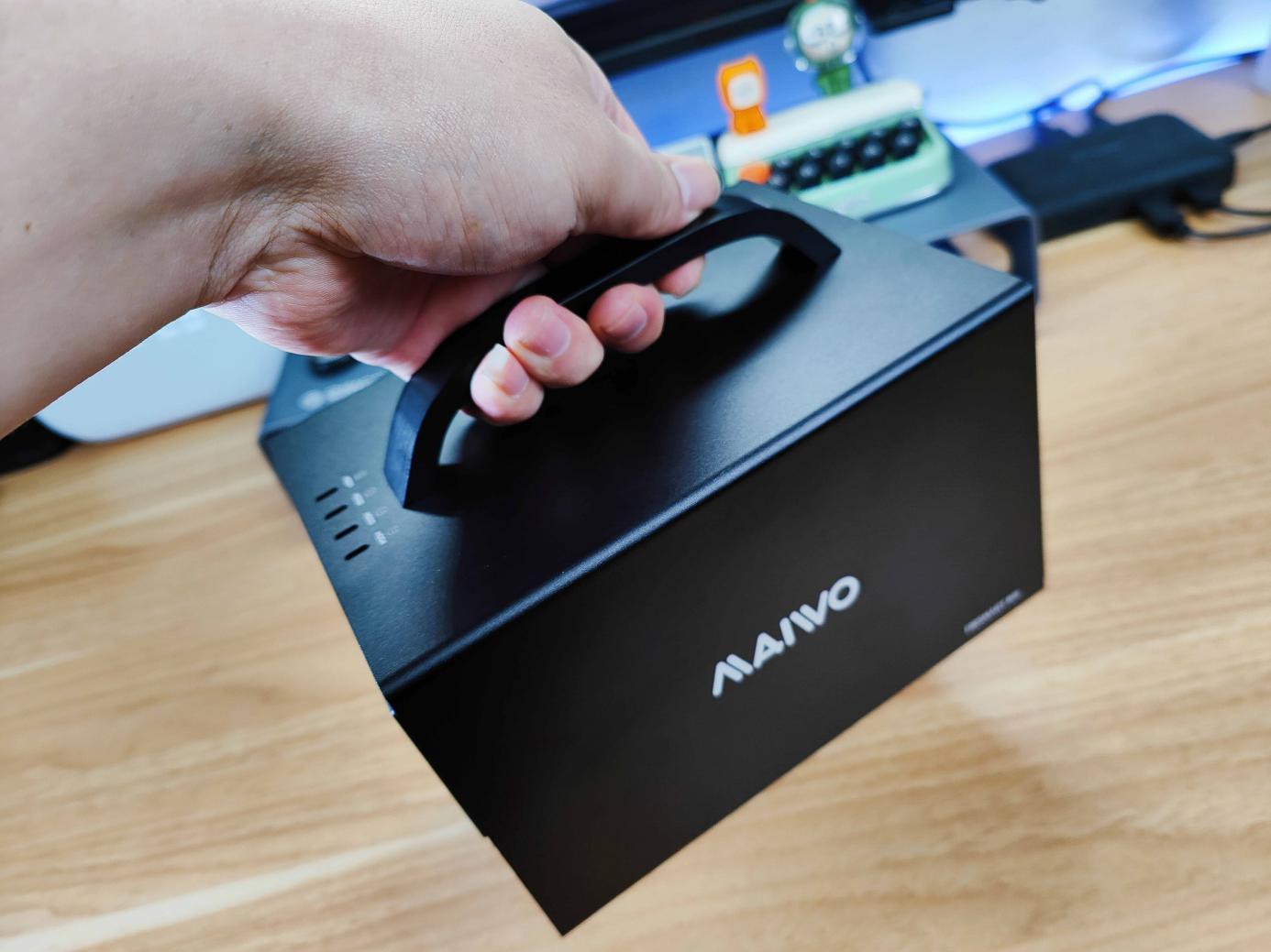 麦沃四盘位手提阵列盒外观上长方体的设计,镁铝合金材质,表面磨砂工艺打磨,加上黑色的配色,显得硬朗有型。使用镁铝合金的好处是可抗磕碰还有重量上的轻质,还可带来散热上的友好,更好的保护内置硬盘的长久使用。