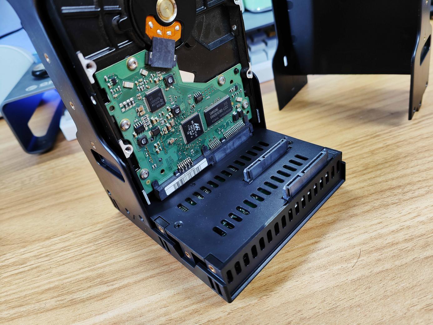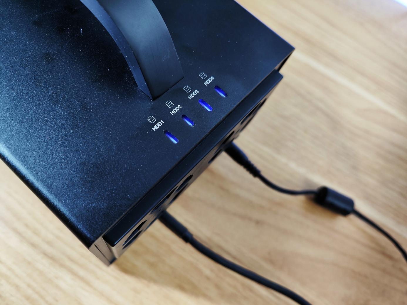 最特别的还是内部四盘位的设计,抽拉可拿出内部硬盘卡槽。四个独立插槽,单个硬盘位最大可支持16TB的硬盘使用,总容量可达64TB,这样的容量有多少文件存储不下的。使用的硬盘是老式的3.5寸机械盘,对于家里有老机器更换下来的盘可二次发挥余热继续使用,每块硬盘安装对应独立的HDD标识灯显示,可直观的查看使用情况。