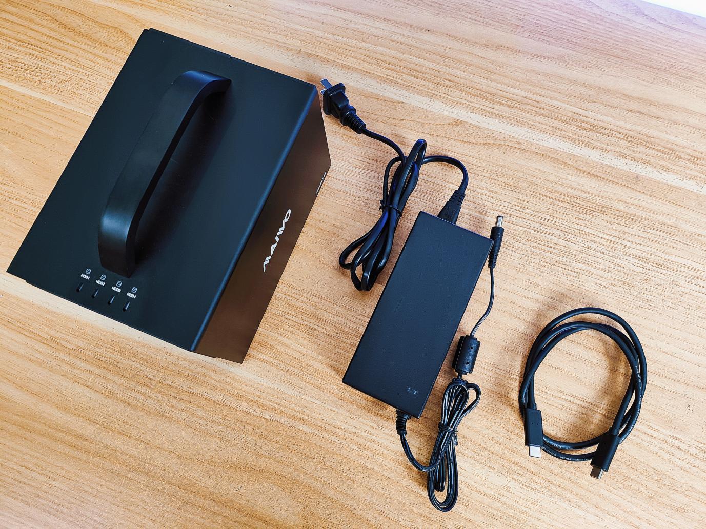 配件很简单,麦沃四盘位手提阵列盒、外接电源适配器、双C口数据线。