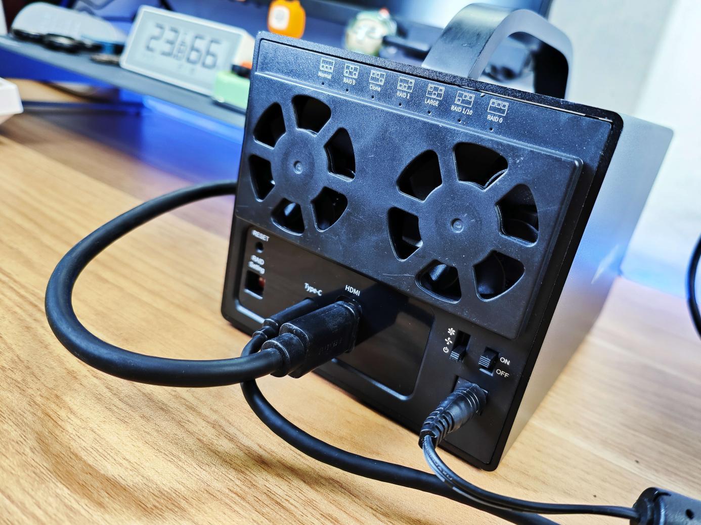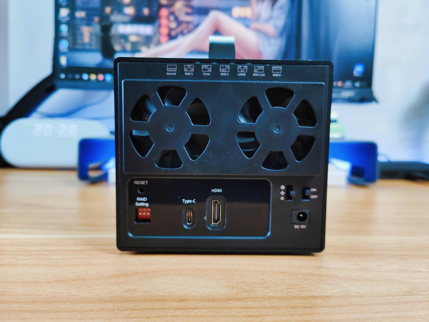 后置为接口与风扇区域,接口上相对不算多,但足够使用。电源开关键、风扇开关与调节键、Type-C接口、HDMI、DC电源接口、RAID设定键/复位键。