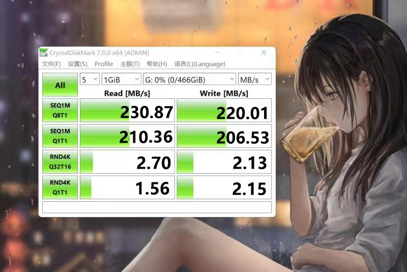 选择这款产品,我们最关心的还是读写速度,麦沃四盘位手提阵列盒采用C-C的接口方式,支持USB3.1的接口使用,支持正反盲插使用,5Gbps的传输带宽。机友使用专业的硬盘测速软件测试内装的磁盘,实测读取230MB/s,写入220MB/s,这对于机械盘来说速度上很优秀了,机友实测过普通单盘位连接测试也仅能达到150MB/s,这也是得益于阵列盒USB3.1的接口,和笔记本的雷电接口,让速度读写上更具优势。