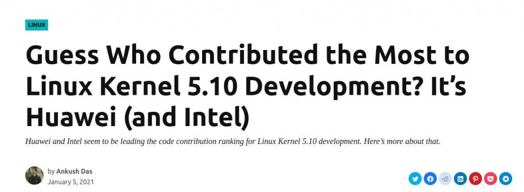 华为、英特尔是对 Linux 5.10 内核贡献最大的两家公司华为于 2018 年面向 Linux 发布了 EROFS 文件系统,作者为华为工程师高翔,该系统于 2019 年被整合进 Linux 5.4 内核主线。