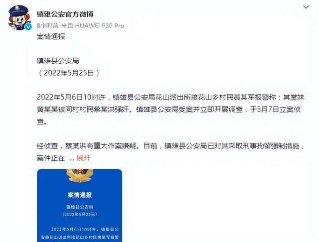 据云南省镇雄县公安局官方微博通报,2022年5月6日10时许,镇雄县公安局花山派出所接花山乡村民黄某军报警称:其堂妹黄某某被同村村民蔡某洪强奸。镇雄县公安局受案并立即开展调查,于5月7日立案侦查。
