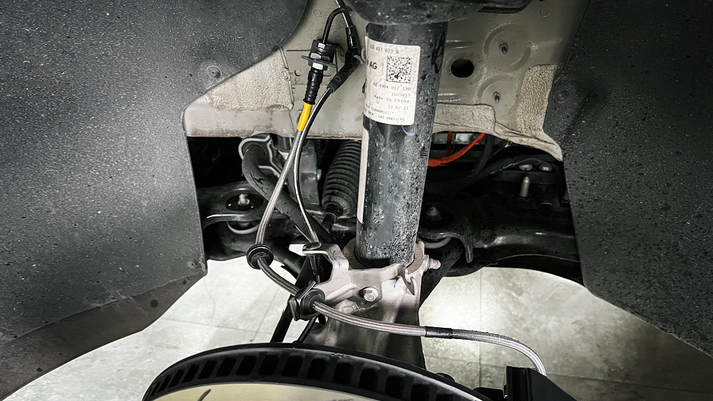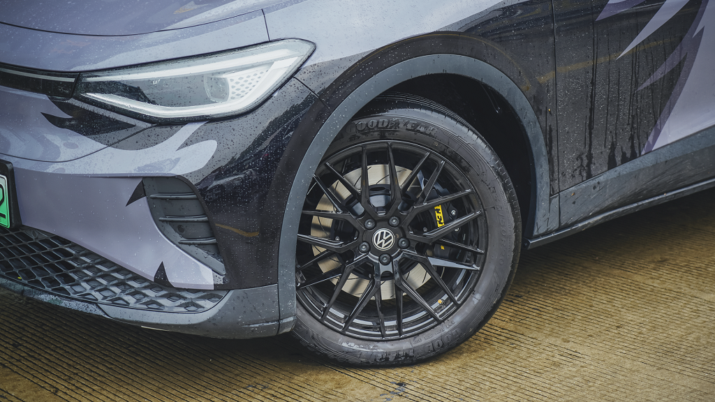 改装项目:大众ID4前轮改装TEI Racing P60ES大六活塞街道性能刹车卡钳套件,改装20寸轮毂搭配378x32mm划线纹分体盘。(套装有刹车卡钳、刹车盘、刹车片、刹车钢喉、专车专用桥码、DOT4刹车油 )