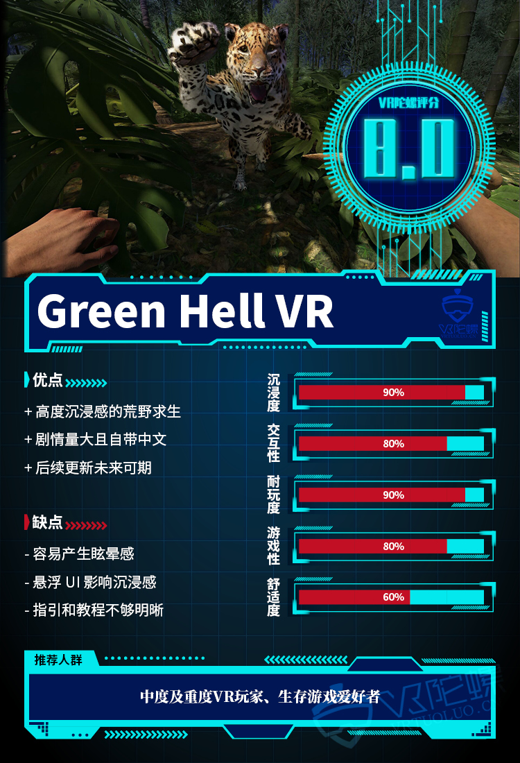 亚马逊雨林充满了神秘感和眩晕感,荒野求生的乐趣则与难度并存,更加优秀的沉浸感和交互性都是VR版的独到之处。相对繁杂的系统和硬核的难度均有一定上手门槛,故本作不太适合轻度VR用户,但这种挑战也正是《Green Hell VR》的魅力所在!