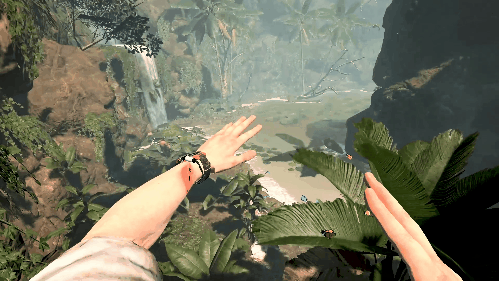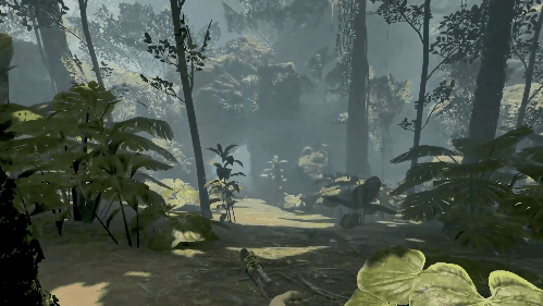 VR版在交互性方面的改编也值得称道,包括砍树、点火、游泳、削尖木头等各种动作在体感操作时都颇有代入感,而诸如斧头、长枪、弓箭等武器的制作也全都要亲力亲为。把树叶作为绷带缠绕在手上,拿下吸附在手臂上的水蛭,用双手捧起收集的雨水放到嘴边喝下……大量交互设计在刚开始时可能会让玩家有些手忙脚乱,但只要适应一段时间后就会变成自然而然的动作。不过主角胳膊的角度略有问题,在大幅举起时会显得不太自然。