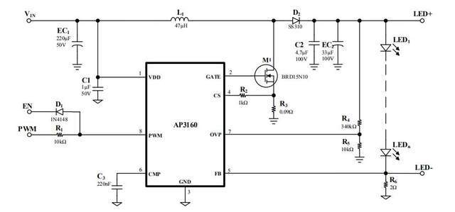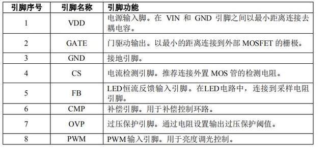 AP3160一共8个引脚,第一引脚是VDD电源输入端,第二引脚是GATE门驱动输出。第三是GND接地。第四是CS电源检测引脚。第五是FBLED恒流反馈输入引脚,第六是CMP补偿引脚。第七是OVP 过压保护引脚,第八是PWM 输入引脚,用于调光控制,是一款高性能的,专为液晶电视机和液晶显示器恒流背光应用而设计的 DC/DC 升压电路。