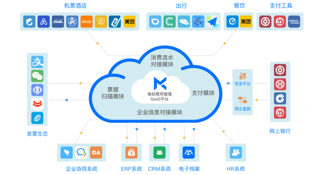 在费用管理SaaS模块,每刻对外打通了差旅平台、信用支付、发票平台等,同步采集消费和发票数据,打通了税务总局发票底账库,进行票据的智能识别和验真查重;对内打通了企业ERP、OA、资金平台等应用系统,实现自动记账、批量支付、预算控制等功能。