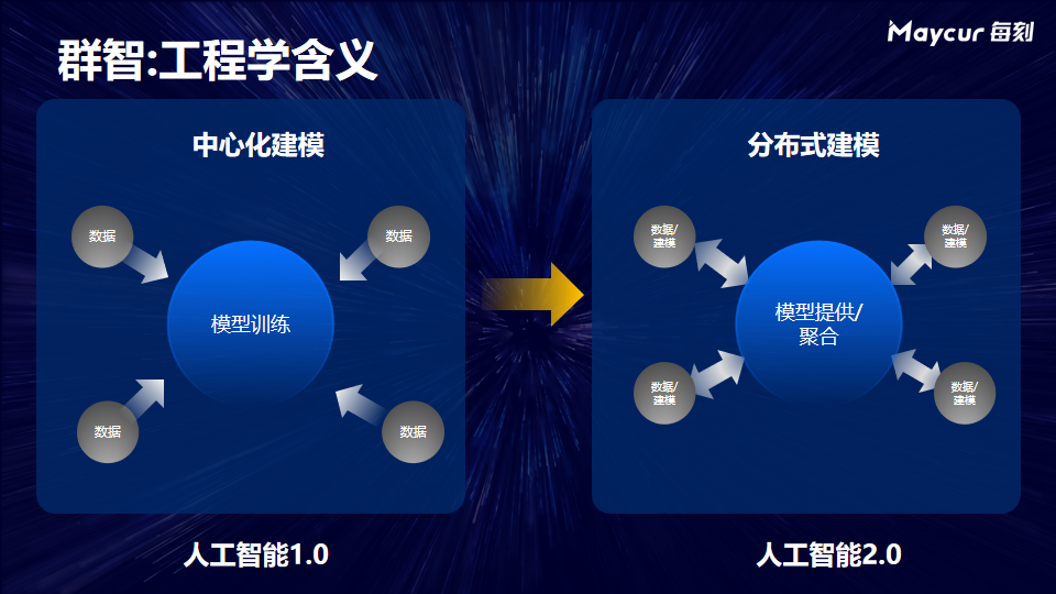 魏美钟:当然“群智”不光是人的群体智慧,还可以结合数字时代技术的智能。人工智能1.0就像专家一样,什么样的发票拿过来都能识别,但是每个企业的合同模板不一样,中心化的人工智能很难解决。在2.0的时代,解决方案模型是去中心化的。通过我们技术的输出,让每个企业根据自己的业务的需求、单据的特点以及合同模板的特点,自己进行训练。