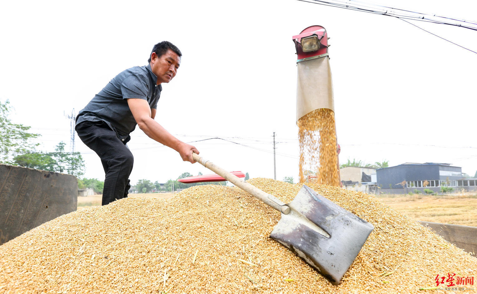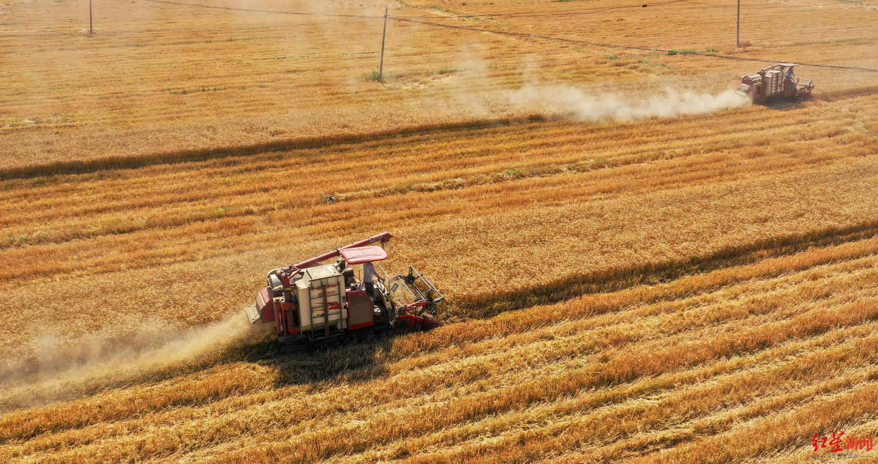 红星新闻记者了解到,在青白江区弥牟镇现代开放农业综合功能区,3000余亩麦穗在阳光照耀下“笑”弯了腰。成都智农农机专业合作社小麦收割现场,忙得热火朝天,8台收割机一字排开,伴随着轰鸣声,在金灿灿的麦浪间穿梭……不一会儿,运输车装得满满当当。