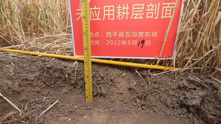 技术人员分别在应用区和对照区挖掘剖面坑观测耕层深度,通过测量,应用区耕层深度为21cm,对照区为13.5cm,应用区较对照区耕层加深7.5cm。