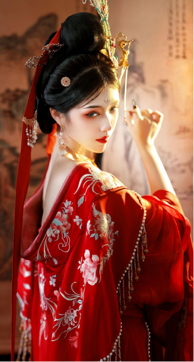 谁家殊丽迎光而来,眉如黛眼凝光,额间花钿和眼尾的红妆和衣服交相辉映,适合大气张扬的女孩子。