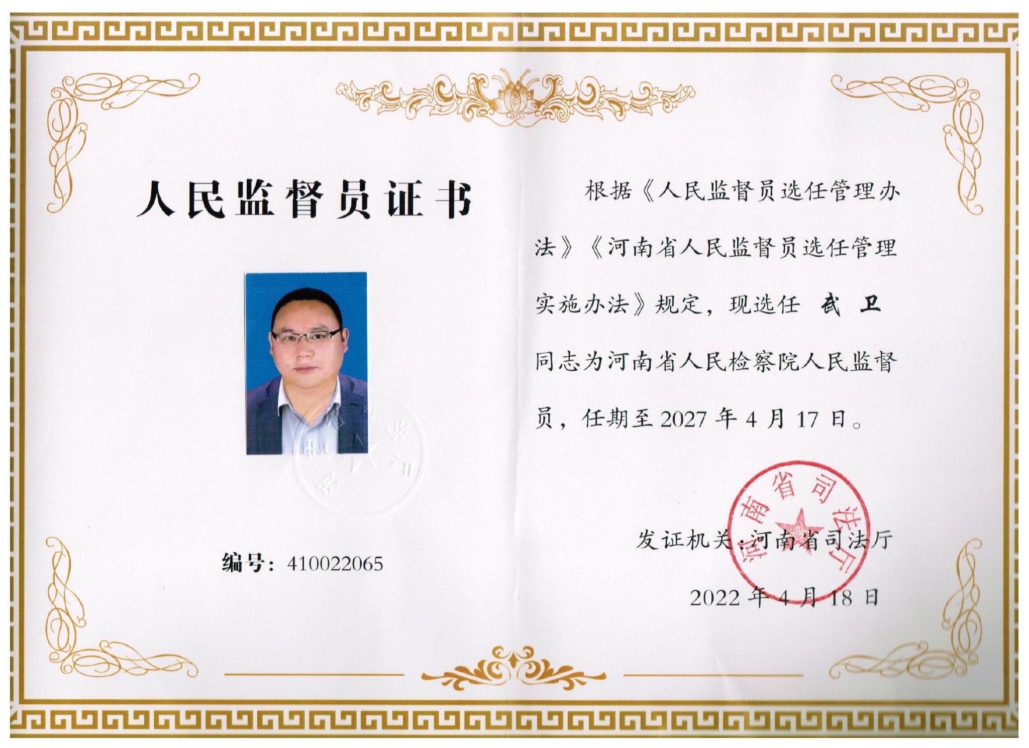 近日,河南省青年企业家协会会员、河南省创元物联网科技有限公司总经理武卫同志当选河南省检查院人民监督员,河南省司法厅为新一届人民监督员颁发了“人民监督员证书”和“人民监督员工作证”。