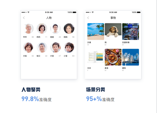 通过图片内容识别,智能地对用户海量照片数据进行精准分类,分类精度可到具体事物。此外,还可针对场景和事物进行关键词查找,如:美食、人文、动物、娱乐等;52个事物与场景分类,条理清晰呈现你的美好生活,让精彩影像不再凌乱!