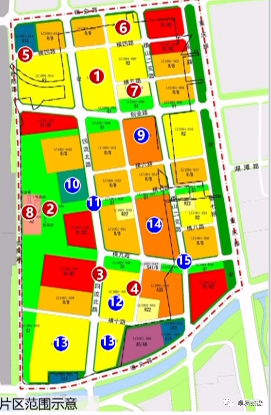 青钢片区遵义路、瑞金路、重庆路和贵阳路合围区域,占地面积160万㎡,预计今年启动图中2-7地块,2023年、2024年启动9-15号地块。