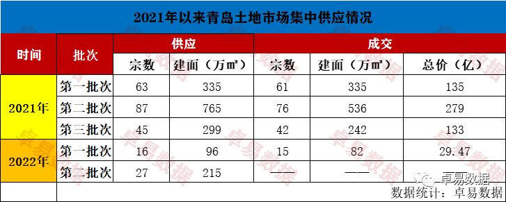 2022年5月27日,青岛市第二批次集中供地发布公告:27宗土地,总占地99万㎡,总建面215万㎡,起拍总价127亿。与4月份拟预告的35宗相比,减少了市南、李沧、城阳、崂山等11宗地,增加了西海岸古镇口3宗地。