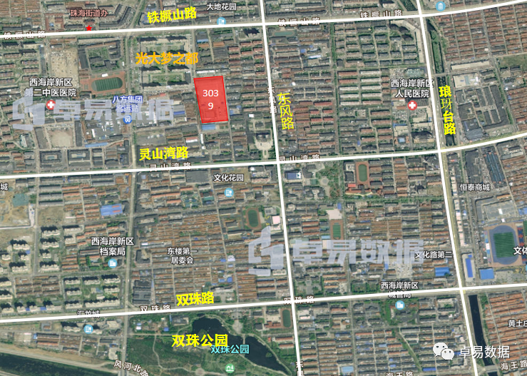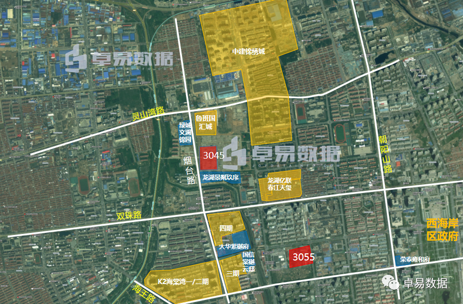 这两块地就是太行园林地块,2宗地总建面25.6万㎡,从去年下半年开始被很多人盘过,地理位置比较优越,南侧的万科海岸蓝山在当时的市场下成为了“爆款”,当然位置好地价也是西海岸本场中最高的,最高楼板价高达7490元/㎡。