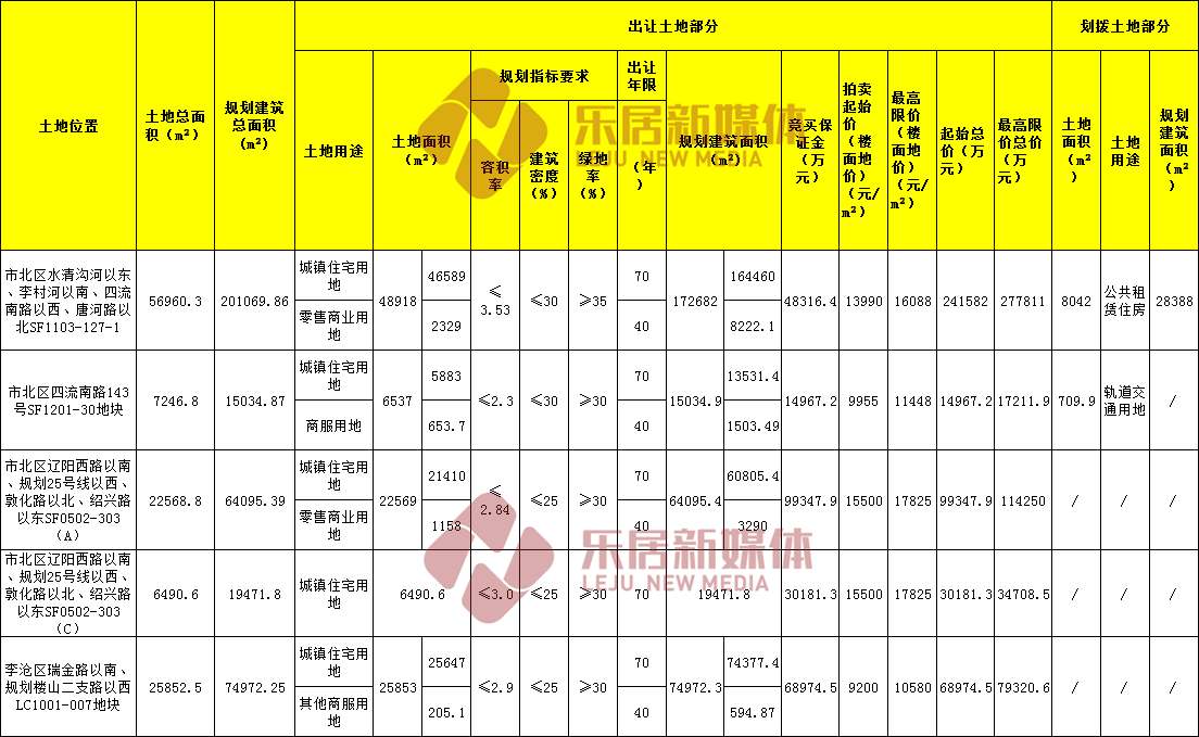 4号地块位于市北区辽阳西路以南、规划 25 号线以西、敦化路以北、绍兴路以东 SF0502-303(C),占地面积6490.6㎡,容积率3.0,规划建面19471㎡,为纯住宅用地,起始楼面价15500元/㎡,起拍总价3亿。
