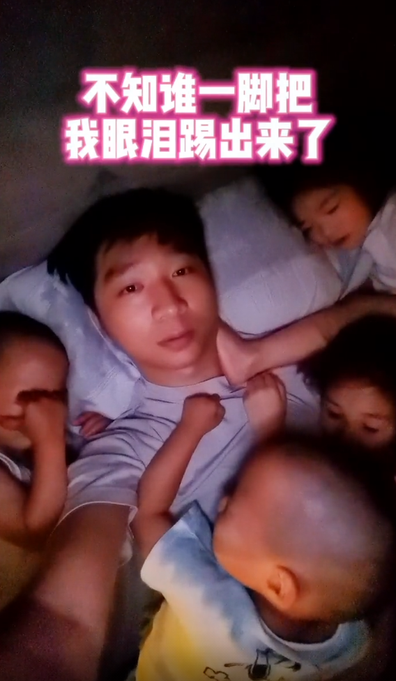 可是没想到的是,最后连两个双胞胎儿子都要求跟爸爸一块睡觉,四个孩子全都环绕在陈大愚身边,真是甜蜜的负担。只见女儿用脚踢到了陈大愚脸上,连眼泪都被踢了出来,陈大愚也是一脸无奈,身边的两个光头儿子也相当抢镜。