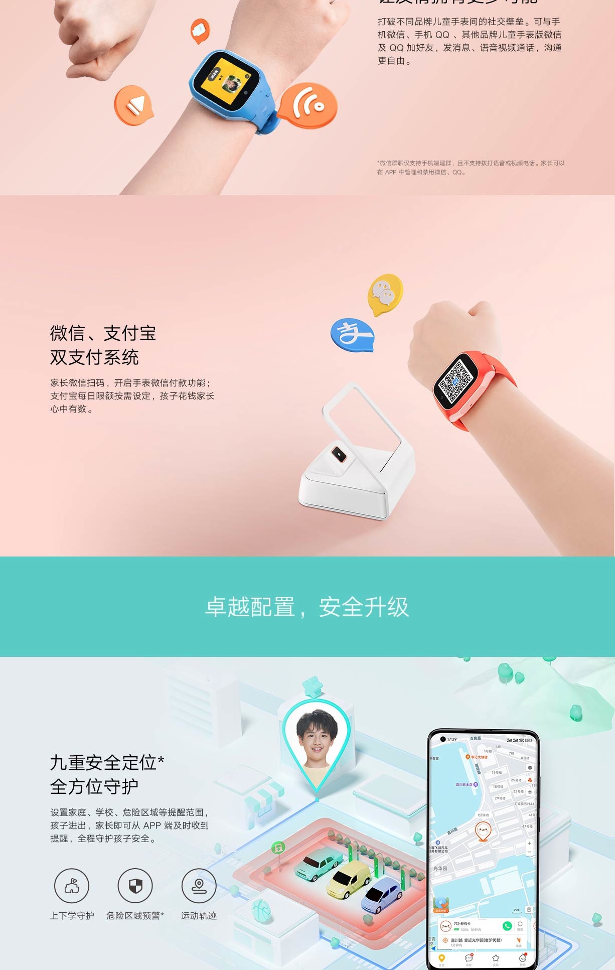 此外,它还支持微信、支付宝双支付系统,需要家长微信扫码开启手表微信付款功能即可使用;而支付宝每日限额按需设定。