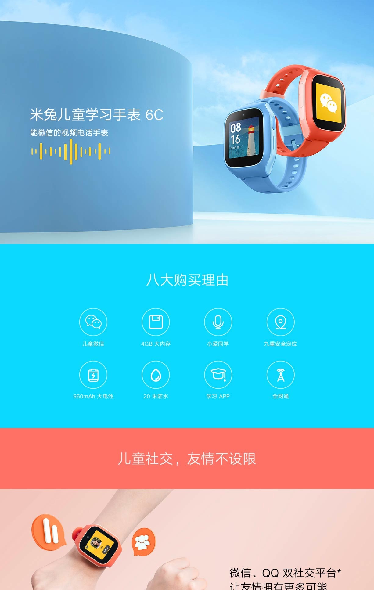 其他方面,这款产品支持全网通,前置 200 万像素大广角摄像头,内置 950mAh 高密度锂电池,正常待机 8 天,日常标准使用续航 4~5 天,支持 20 米防水,内置小爱同学和精选学习 APP。