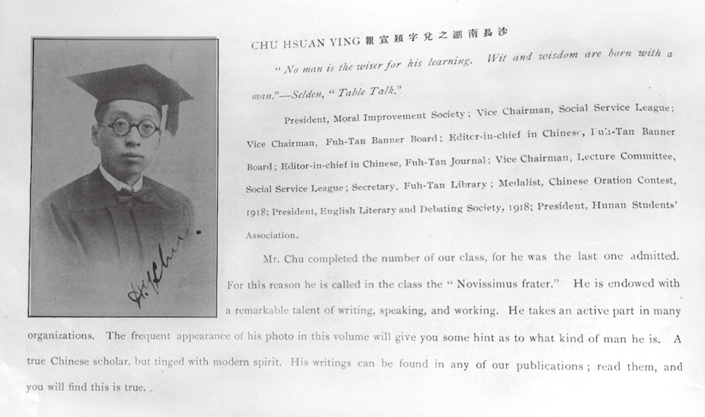 1919年级复旦毕业生瞿宣颖,起草上海学联章程、中西宣言及电稿。图片来源:《复旦年刊(1919)》