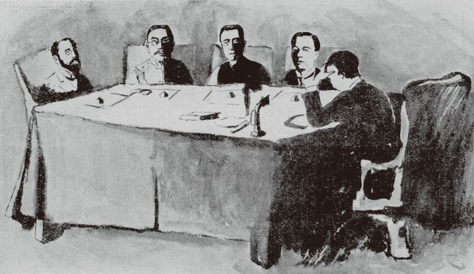 复旦学生手绘董事漫画,形象颇为传神,且能反映各人在董事会中地位(从左到右:于右任、唐绍仪、聂云台、简照南,及一位无面孔者)。图片来源:《复旦年刊(1922)》