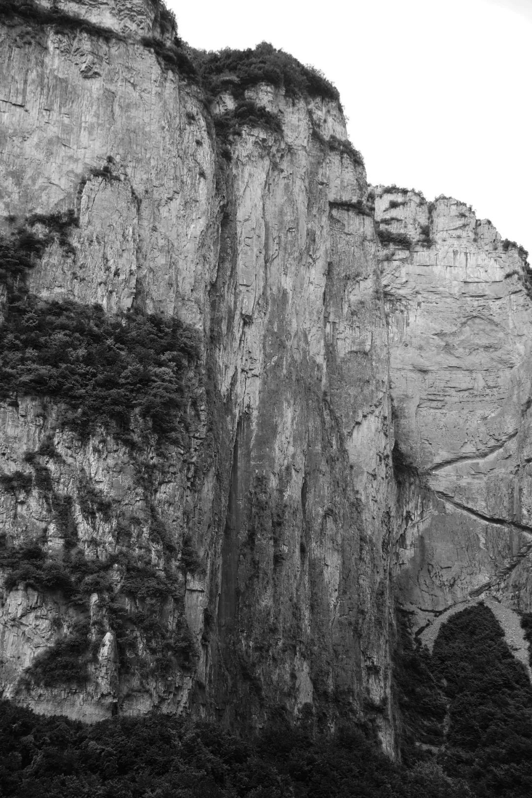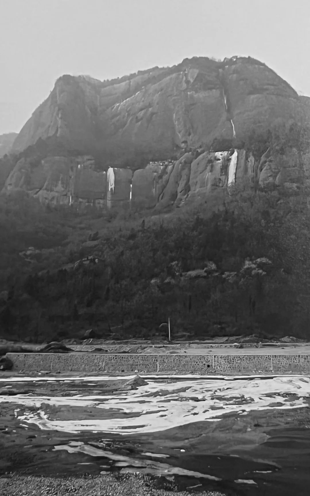 这条瀑布的姿态妙极,刚健婀娜兼而有之,上源横栏数截,俨然汉隶笔意。一泻千尺,易落直率,故末端燕尾分瀑,意趣美曼,因势生巧,充分表现出智者乐水的意境,和主峰浑厚并肩相比,仁者乐山的哲意被衬托得格外具体。