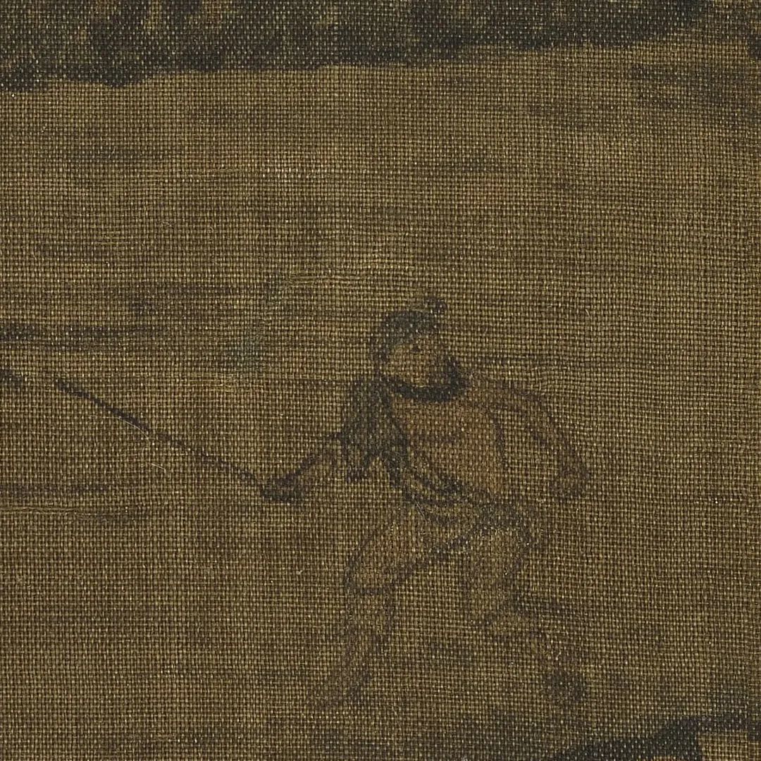 涧桥左上端坡平坦之处,有一僧人负经担施施而来,头戴遮身大帽,这种帽子也是唐宋古代模样,日本僧人至今仍戴这种大笠帽,因为他们事事都要保存往昔情调,所以中国不多见者,每每仍在日本保存得十分完整。在夏圭的《溪山清远图》上,那座大丛林边的僧人,戴的也是这种大笠,可知南宋时这种帽子还是很通用的,只是如今却少见了。