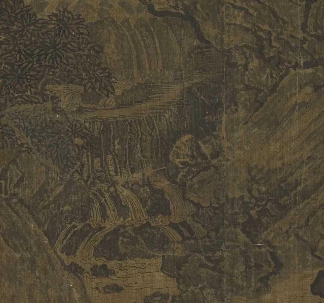 另一处是在那条千尺悬瀑的幽壑深沉。这是要煞费苦心的,用墨太浅,将浮而不沉,着墨太多,又痴凝板刻。浮则外露,无从显岩壑深涵之致,过黑则与全幅丘壑不易谐调,有割裂画面为两半之虞。范华原于此处运墨具见工夫,既深浅合宜,又推移有致,既得山川之真形廓,又衬得出千尺悬瀑的蜿蜒体态,不见一点生硬笔迹,墨色之运用,真臻元化!