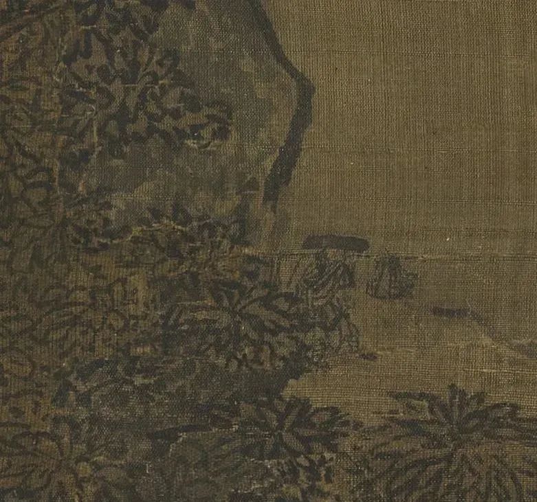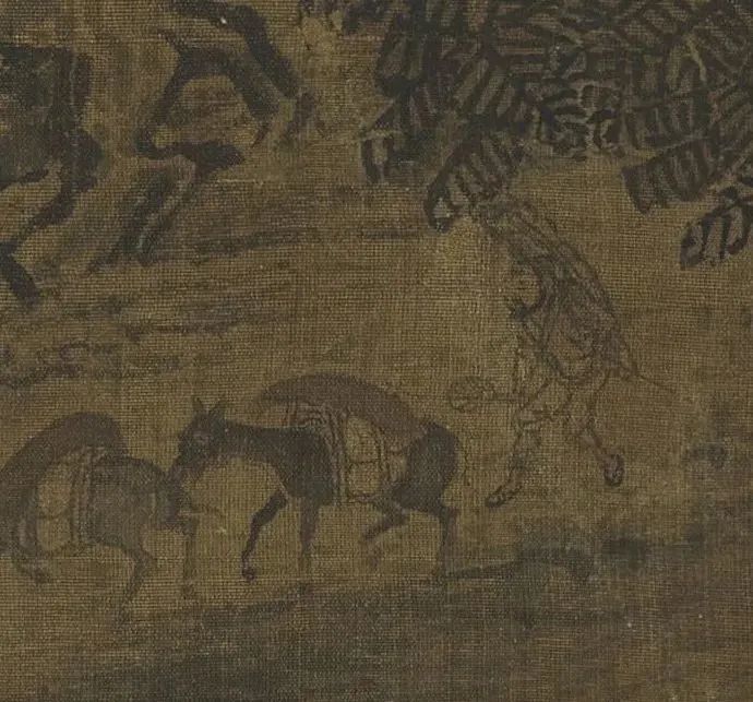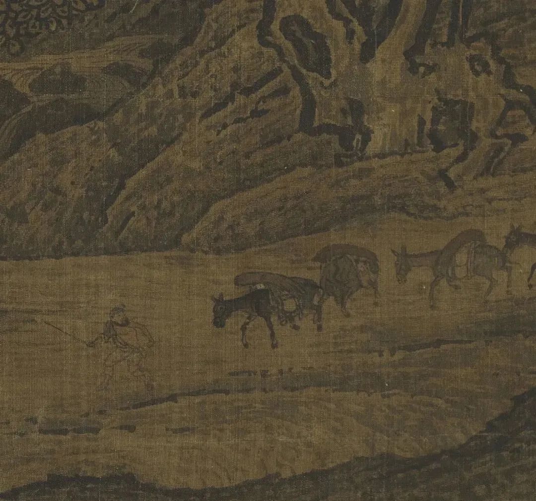 人物驮马,亦具见巧思,人小而神全,唯郭熙《早春图》及夏圭《溪山清远卷》足以匹之。人马体小,正以此比例山川之巨伟。置于下方右角,在使其行势往趋画之中央,所以看来异常妥贴,若把这队人马置于画之中央或左方,那感觉就恶劣多了,不但使人觉得这队马帮立刻就要走出画面,而且动势所趋,连主峰都要为之曳倒,那就不是上乘的好构图了。