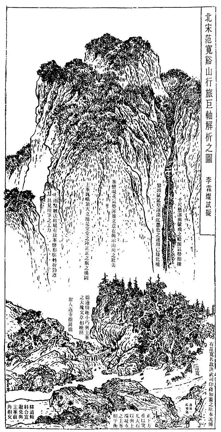 所以有这样一幅解析之图在手,我这篇文字的要点可以说都囊括在这里了:范宽名款的发现,在这里用箭头指示出它的部位;我揭橥的绘事欣赏的新六法,一一都扼要地在图上就地有所说明。真是千言万语,不如解析一图。我相信若能把我国的名画都能如此地解析一道,然后再“综合地”给予正确的评价,那一定可以对我国的绘画历史,有一番崭新的贡献。众擎易举,这一番新的尝试希望能得大家的重视,并求各位专家硕学不吝教益,然后宣扬已久的“新文艺复兴”才有希望能早日实现。