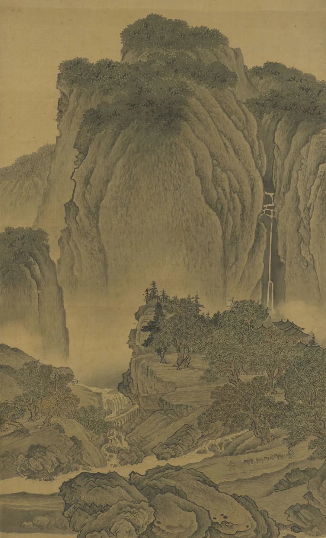 天下名山僧占多,范中立这幅巨制上的梵宇琳宫亦被安置得恰得其所,不但殿阁翚飞,上接千尺悬瀑之余势,而且环寺松杉密茂,证实“丛林”巨刹之名号。对景静观,俨然身在深山古寺之中。故涧桥之左,行脚僧人正负笈而归寺,林端驿道,驮马役夫正跨寺而前征,一还一复,分明以此巨峦下之野寺为中心。缅想卜居此寺,仰观天柱一峰,迥出云霄,悬瀑自天外飘落,雁荡之大龙湫仿佛可见。寺周森林郁茂,崖下流水潺湲,水际巨石,驿道桥边,随处行坐,皆有佳趣,如此林泉清福,怎不令人羡煞。郭熙《林泉高致》中论画山水,有“可以居”之说,范华原此幅此寺,真是可以终身以居。