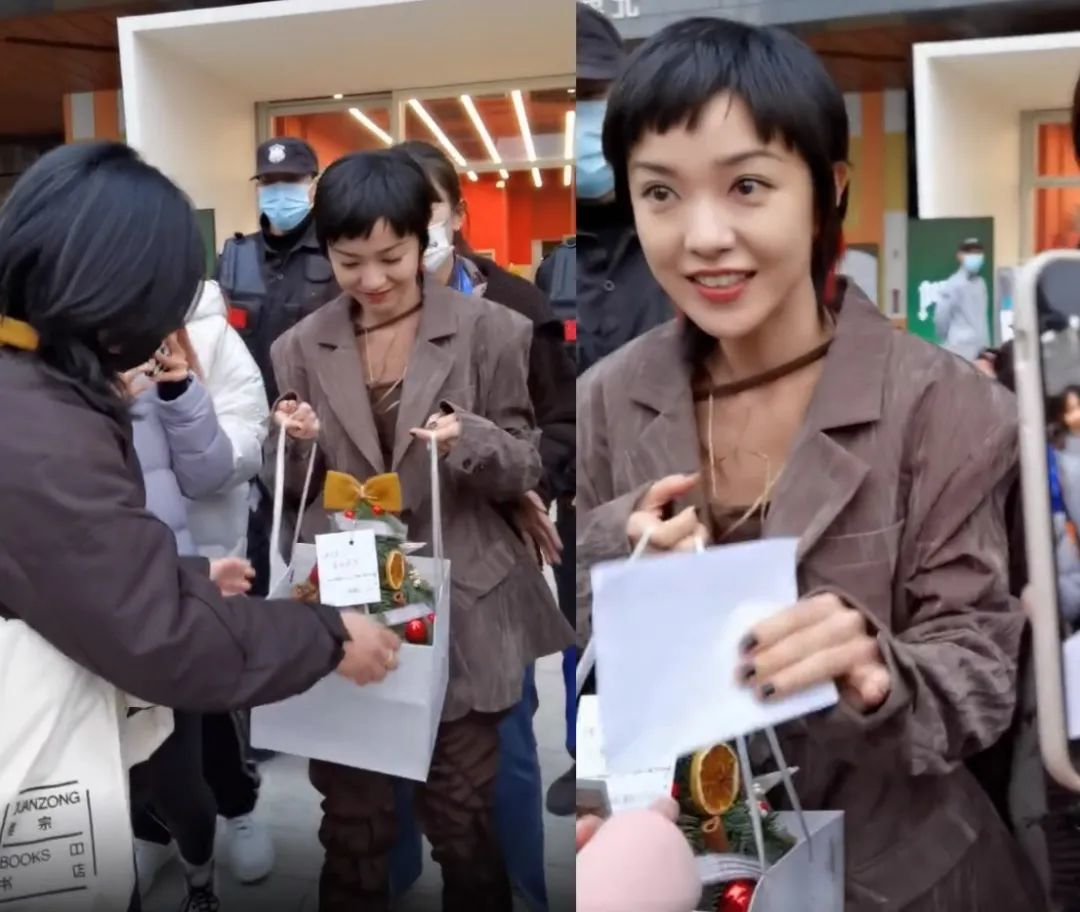 路人镜头里,郭采洁也留着狗啃刘海造型,很有个性,她不会化那么浓的妆,看起来清爽很多,也显得有灵性。郭采洁对围观路人、粉丝比较热情,跟酷酷的外表有反差。