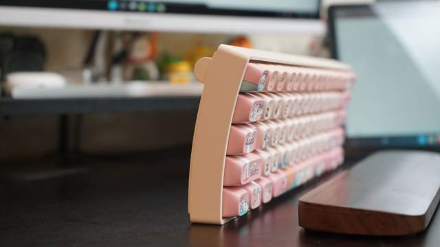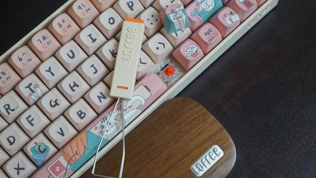 Lofree洛斐小翘机械键盘的键帽更换起来也并非难事。搭配的键帽快拔器设计精巧,橙色与淡粉色的撞色设计,刻有Lofree字样,处处都体现着细节。用快拔器一个一个拔出键帽也是轻松之举,拔出后直接更换新的一套键帽即可。有DIY小心思的朋友当然还可以几套键帽混搭起来使用。