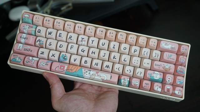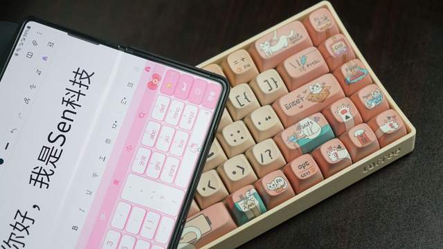 用上Lofree洛斐小翘机械键盘之后,把手机的键盘也同步成了粉色的猫咪皮肤,哦豁这是谁的少男心!这是我的少男心!