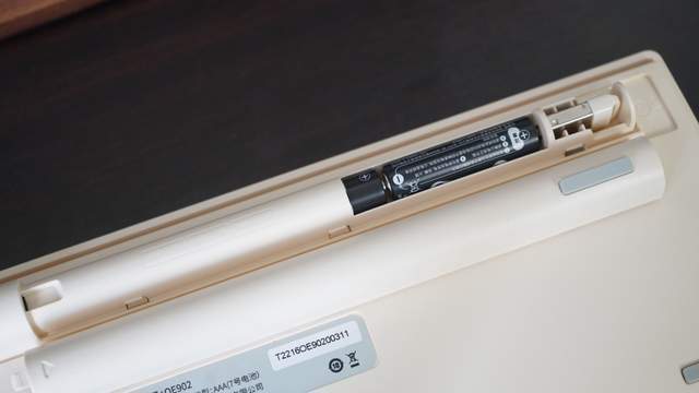 Lofree洛斐小翘机械键盘底部右边是电池仓,根据小图标提示安装三节电池即可使用。电池仓内还装有无线连接的2.4G接收器。
