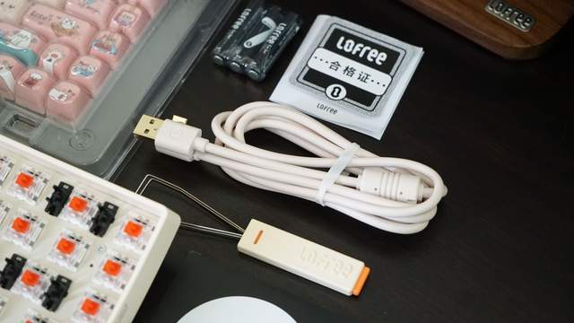 拆开Lofree洛斐小翘机械键盘的外包装,里面除了粉色键帽和键盘,还有粉色的数据线、2.4G接收器、键帽快拔器、三节电池、和产品说明。